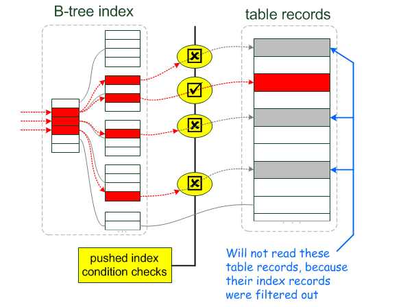 尝试只使用索引列检查是否符合条件。如果条件不满足,回到步骤1。只有满足条件才会回表读取数据。